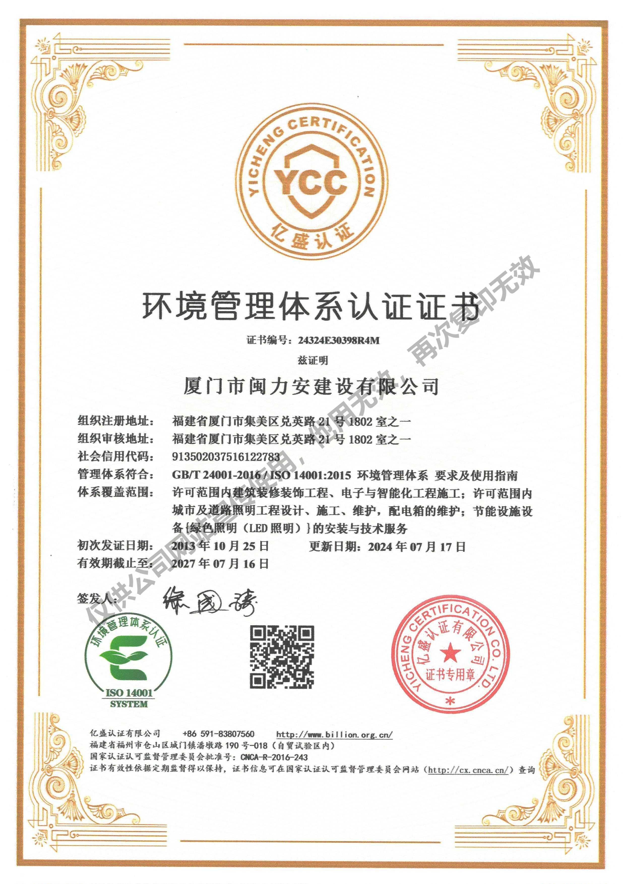 祝賀閩力安取得:環境管理體系認證證書