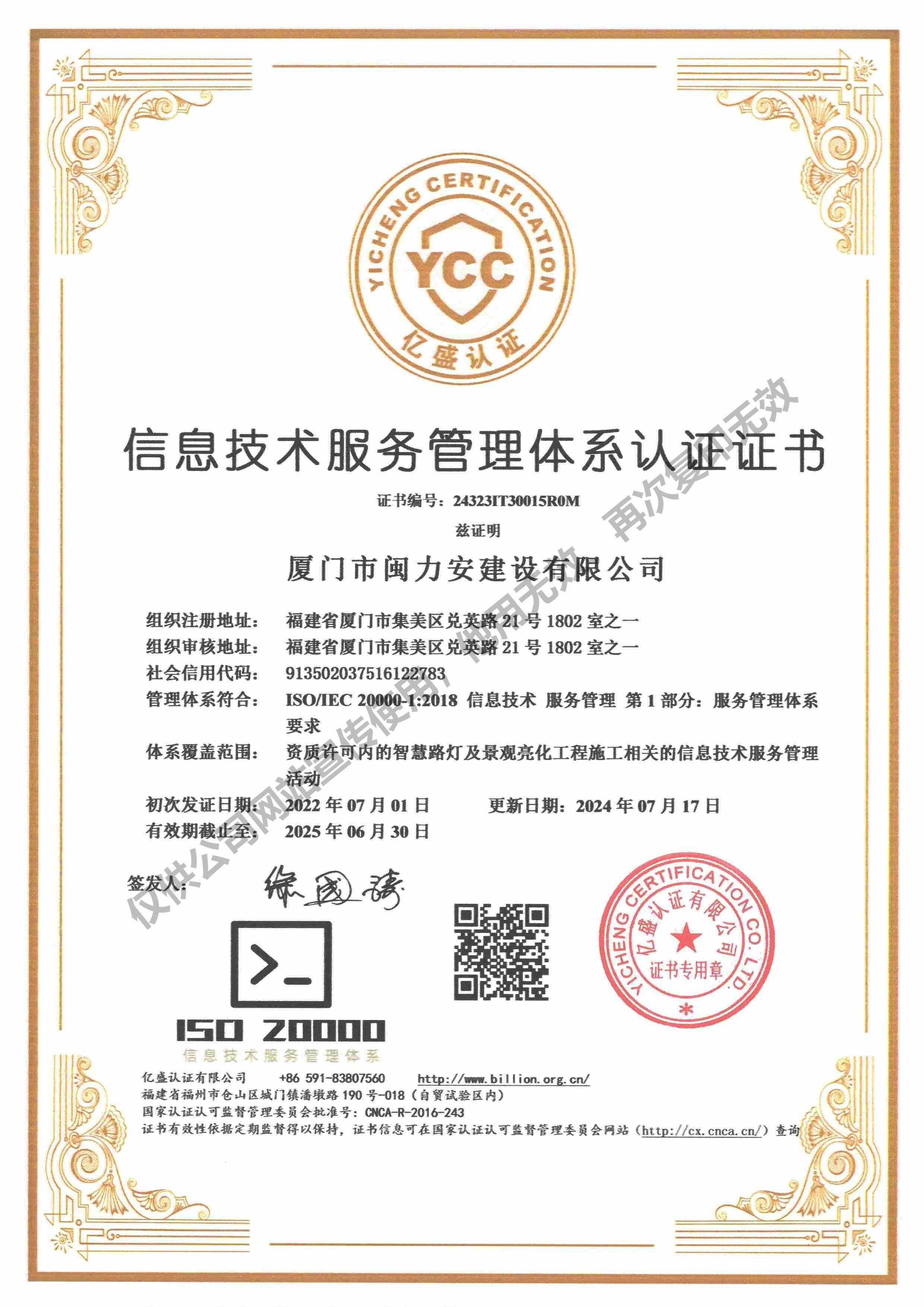 祝賀閩力安取得:信息技術服務管理體系